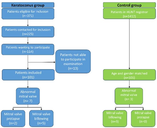From the 371 patients in the registry for CXL-treated keratoconus patients, a total of 225 patients were invited to participate in this study. A total of 114 patients responded in favor of being included in the study, and a total of 101 patients managed to partake in the cardiac evaluation. Of the 101 patients, we found seven patients to have an abnormal mitral valve. Of these seven, two had mitral valve prolapse, and five patients had billowing. We used the region-based HUNT registry to find 101 age- and gender-matched controls. Here, we found three patients with abnormal mitral valve, no cases of mitral valve prolapse, and three cases of billowing. CXL = corneal collagen cross linking, HUNT = Trøndelag Health Study.