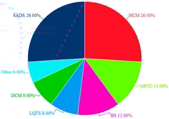 Sudden cardiac death (SCD) is a devastating event at any age, particularly among the young. The annual incidence rate of SCD in individuals under 35 years of age ranges from 1 to 13 per a 100,000 population [1,2,3,4]. In adults, the most common cause of SCD is coronary artery disease, which is 10–15 times more prevalent than other cardiac conditions [2,3,4]. The second most frequent cause of death is unexplained. The term sudden adult death syndrome (SADS) has been used for cases with normal postmortem study. Genetics and family study leads to the identification of inherited arrhythmia syndromes or early cardiomyopathic forms in up to 40% of SADS cases [5,6]. Cardiac non-ischemic conditions, such as cardiomyopathies and channelopathies, are common causes of SCD in individuals under 35 years and in athletes [7,8].