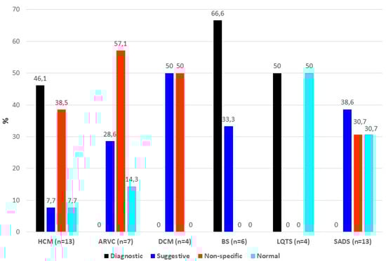 Final clinical diagnoses and ECG findings. Chagas cardiomyopathy, catecholaminergic ventricular tachycardia, and endomyocardial fibroelastosis are excluded from this analysis. HCM: hypertrophic cardiomyopathy; ARVC: arrhythmogenic right ventricular cardiomyopathy; BS: Brugada syndrome; LQTS: long QT syndrome; DCM: dilated cardiomyopathy; SADS: sudden adult death syndrome.