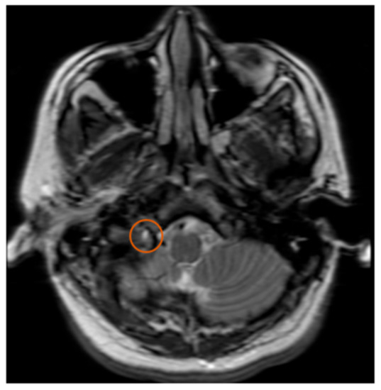 MRI T2. Orange circle indicates edema at the junction of the Jugular Foramen and the Hypoglossal Canal.