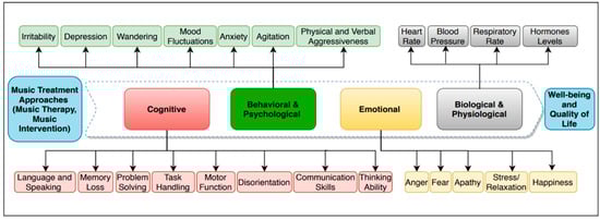- Behavioral and psychological: The psychological effects of music help to reduce mood fluctuations and behavioral disorders such as depression, agitation, and aggression [2,19,20,21].