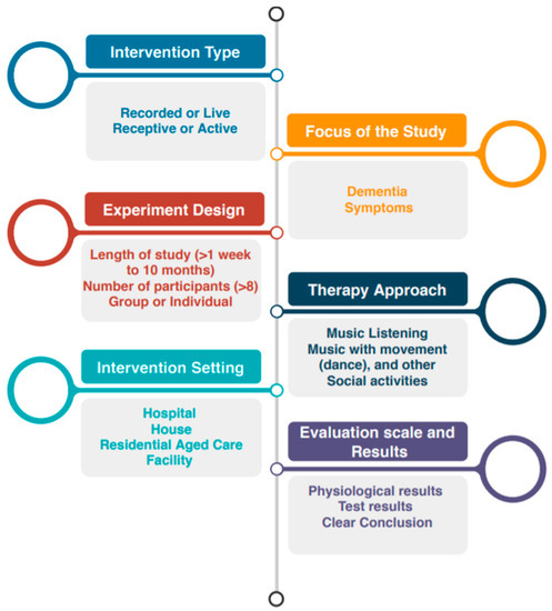 - Sample size: The sample size of the studies varied from eight to 165 participants. In several studies, the sample size of the experiment was less than ten [28,58,61,70]. For example, one research analyzed the behavior of nine PWD who received music therapy [28], where expressing more positive emotions and improvement in their well-being and communication level were observed. However, two studies [55,69] included a larger population (120 and 59, respectively) in their research, but did not find any significant changes in PWD symptoms. Hence, it is not clear that music caused changes in the level of dementia symptoms because of the use of a smaller sample size.