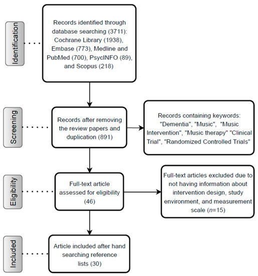 The objective of this meta-narrative review was to investigate the publications using a qualitative approach and systematic review by highlighting the contrasts and similarity on music’s efficacy. Electronic searches in the Cochrane Library (1938), Embase (773), Medline and PubMed (700), PsycINFO (89), and Scopus (218) databases were performed to find all of the peer-reviewed publications in English that had the keywords and search terms “Dementia”, “music”, “music intervention”, “music therapy”, “clinical trial”, and “randomized controlled trials” in their titles and abstracts. The time frame chosen for this search was from 2010 to 2020. In general, studies that fit in all of the following criteria were included in this review: