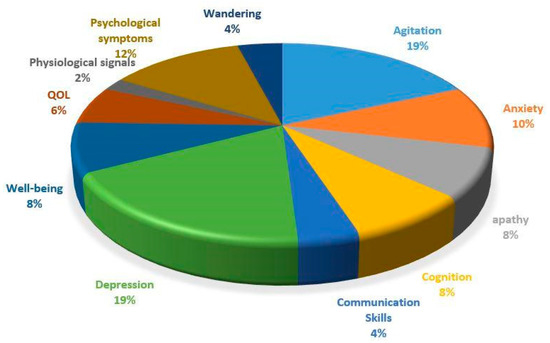 - Specific symptoms of dementia such as depression [19,20,36,37], agitation [20,36,37,38,39], cognition and memory [2,14,40,41,42], quality of life/well-being [43,44], and anxiety [19,36,37,44];