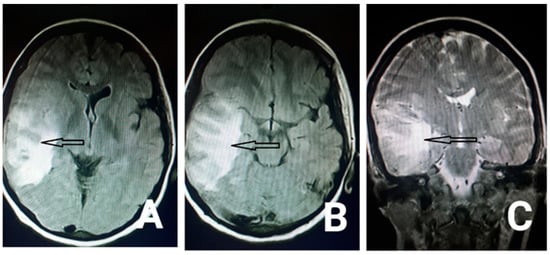 Axial fluid-attenuated inversion (flair) MRI (the arrows in the Figure A,B) and coronal T2 weighted image (the arrow in the Figure (C)) show hyperintensity in the right temporal lobe in the drainage territory of the vein of Labbe.