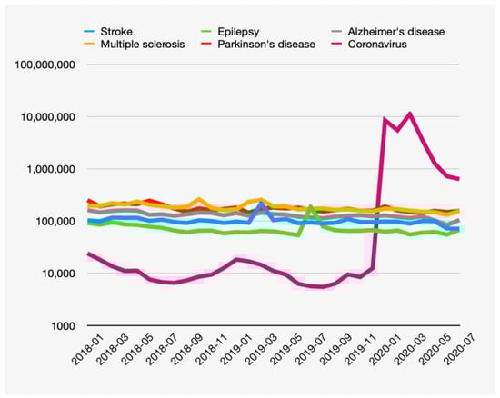 The total monthly number of views of Wikipedia articles on the following diseases was assessed for the period from January 2018 to July 2020: stroke, multiple sclerosis (MS), epilepsy, Alzheimer’s disease (AD), Parkinson’s disease (PD), and coronavirus.