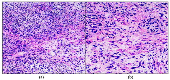 Embrional Rhabdomyosarcoma. Hematoxylin-eosin stained photomicrographs, with original magnification 100× (a) and 200× (b), showing characteristic intersecting fascicle of spindle cells with eosinophilic cytoplasm and iperchromic pleomorphic nuclei.