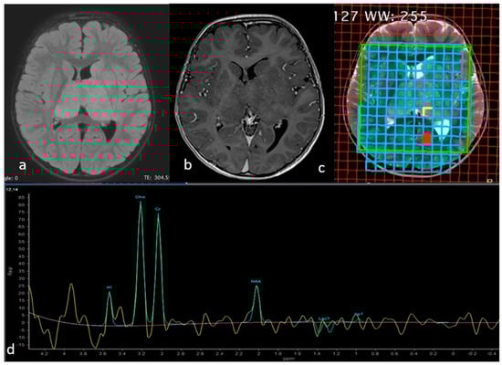 Axial FLAIR (a), Gadolinium-enhanced T1-weighted (b) and T2-weighted (c) MR images showing the lesion involving both thalami and head of caudate nuclei with no evident contrast enhancement. The spectrum (d) at the level of the yellow square in the left pulvinar corresponded to the area of highest cholin peak, where NAA was markedly decreased, chosen as the biopsy target.