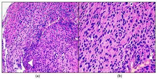 High-grade glioma. Hematoxylin-eosin-stained photomicrographs with original magnification 100× (a) and 200× (b) showing diffusely infiltrating cigar shaped neoplastic astrocytes with obvious nuclear atypia.