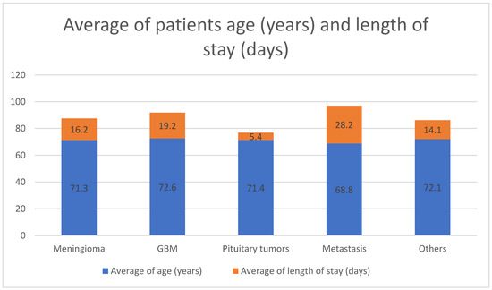 Average of patients’ age (years) and length of stay (days) in different types of tumors. GBM: glioblastoma multiform; Others: hemangioma, lymphoma, schwannoma.