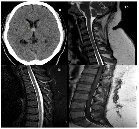 (1a) CT head showing colloid cyst at the level of foramen of monroe (green arrow). (1b,1c) MRI cervical and thoracic spine sagittal images showing no abnormal intramedullary cord signal changes. MRI lumbar spine (1d), T1 weighted sagittal image showing no degenerative disc disease.