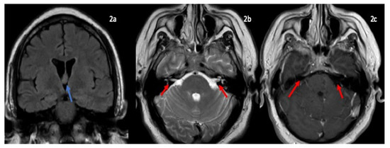 MRI brain coronal FLAIR (2a) showing colloid cyst in the foramen of monro (blue arrow). Axial T2-weighted (2b) axial T1 post contrast images (2c) showing cranial nerve VII and VIII nerve complex (2b) and no abnormal enhancment (2c) (red arrow).