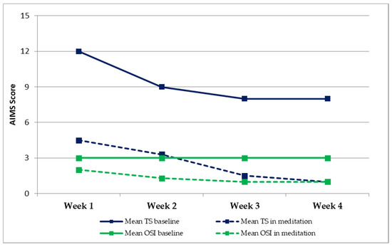 We noticed a generalized reducing trend of the TD over the weeks with a ΔTS between the first and the fourth week of 4 points at baseline condition, as well as a significant intra-intervention decrease in severity and number of TD, with a maximal TS decrease of 7.5 (Figure 1). During the first week, the mean TS before sessions = 12, the mean TS during sessions = 4.5, and Δ = 7.5; the mean OSI before sessions = 3, the mean OSI during sessions = 2, and Δ = 1. During the second week, the mean TS before sessions = 9, the mean TS during sessions = 3.3, and Δ = 5.7; the mean OSI before sessions = 3, the mean OSI during sessions = 1.3, and Δ = 1.6. During the third week, the mean TS before sessions = 8, the mean TS during sessions = 1.5, and Δ = 6.5; the mean OSI before sessions = 3, the mean OSI during sessions = 1, and Δ = 1.5. During the fourth week, the mean TS before sessions = 8, the mean TS during sessions = 1, and Δ = 7; the mean OSI before sessions = 3, the mean OSI during sessions = 1, and Δ = 1.5 (Table 1). AIMS scoring was significantly different between before-meditation and intra-meditation observations (t63 = 7, p < 0.01, paired t tests).