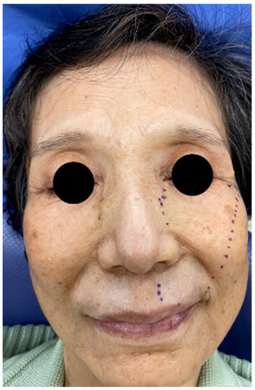 The patient was a 76-year-old woman. She had left upper lip numbness, dry eyes, and dry mouth 5 months prior. The numbness gradually spread to the infraorbital area (Figure 1). She had no painful sensation, but often chews on the left buccal mucosa because of numbness. She was diagnosed with primary biliary cirrhosis based on a liver biopsy and positive antimitochondrial antibody 20 years prior. At the same time, further laboratory tests showed positive anti-SSA and anti-SSB antibodies, and a minor salivary gland biopsy resulted in a diagnosis of secondary Sjögren’s syndrome. The patient was treated with prednisone (10 mg) orally daily for a few years, and after that, ursodeoxycholic acid was administered to treat primary biliary cirrhosis. Approximately 4 months before seeking treatment, the patient was aware of diminished visual acuity due to glaucoma; optic neuritis was ruled out by an ophthalmologist. Magnetic resonance imaging was performed at the Department of Neurology of Juntendo University Hospital, and patients with multiple sclerosis or central neuropathy were excluded.