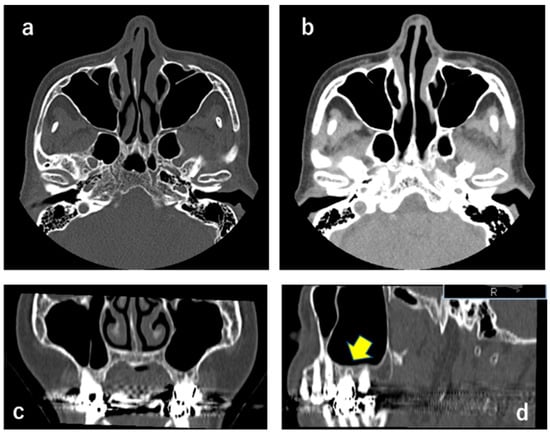 CT X-ray showing that masses were not observed in the left maxillary sinus (a–c). (b) indicates soft tissue density. A sagittal section ((d); yellow arrow) shows an apical periodontitis-like image at the maxillary left first molar, suggesting that this was not relevant to the clinical findings.