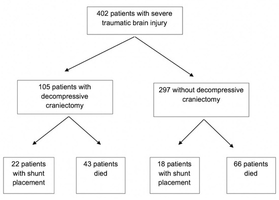 - Goldschmidt, E.; Deng, H.; Puccio, A.M.; Okonkwo, D.O. Post-traumatic hydrocephalus following decompressive hemicraniectomy: Incidence and risk factors in a prospective cohort of severe TBI patients. J. Clin. Neurosci. 2020, 73, 85–88. [Google Scholar] [CrossRef]