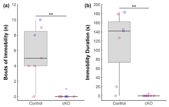 Behavioral effects of Sox2 ablation in the SCN during the forced swim test. (a) Total bouts of immobility and (b) duration of immobility of Sox2 cKO mice (n = 8) and littermate controls (n = 7) over the course of the forced swim test are presented. Female mice are denoted in pink and male mice are denoted in blue. Outliers are denoted by cross marks. Statistical significance from Wilcoxon rank-sum tests is marked with ** (p < 0.01).