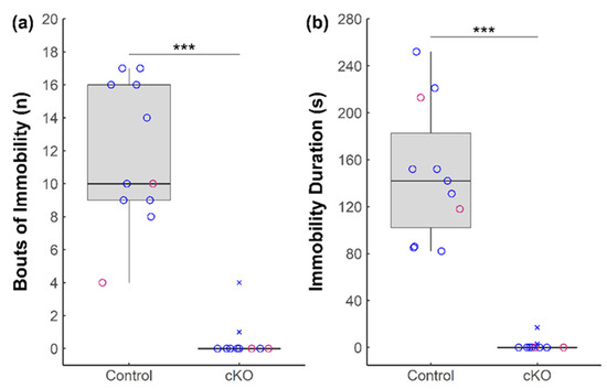 Behavioral effects of Sox2 ablation in the SCN during the tail suspension test. (a) Total bouts of immobility and (b) duration of immobility of Sox2 cKO mice (n = 10) and littermate controls (n = 11) during the tail suspension test. Female mice are denoted in pink and male mice are denoted in blue. Outliers are denoted by cross marks. Statistical significance from Wilcoxon rank-sum tests is marked with *** (p < 0.001).