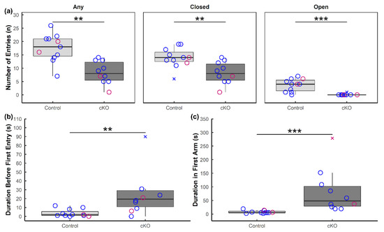 Anxiety-like behavior in Sox2 cKO mice observed during the elevated plus maze. (a) Number of entries of Sox2 cKO mice (n = 10) and littermate controls (n = 11) into any arm of the EPM, only closed arms, and only open arms. (b) Amount of time before the subject first left the neutral middle and entered any arm of the EPM. (c) Duration of time the subject spent in the first arm of the EPM. Female mice are denoted in pink and male mice are denoted in blue. Outliers are denoted by cross marks. Statistical significance from Wilcoxon rank-sum tests is marked with ** (p < 0.01) or *** (p < 0.001).