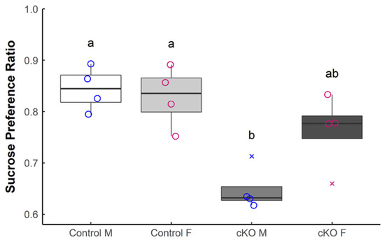 Sox2 ablation reduces sucrose preference in male mice. The sucrose preference ratio during the test phase was determined for Sox2 cKO mice (n = 8) and littermate controls (n = 8). Males (M) and females (F) are considered separately. Female mice are denoted in pink and male mice are denoted in blue. Outliers are denoted by cross marks. Statistical significance from 2-way ANOVA with Tukey’s Post hoc test is represented by letter differences (p < 0.05).