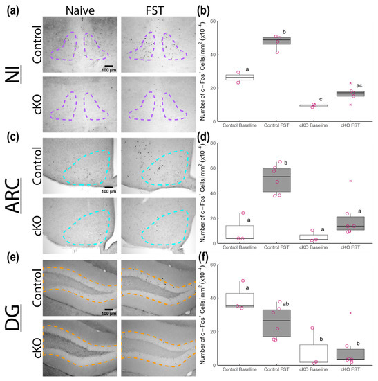 c-Fos induction in various brain regions of Sox2 cKO mice and littermate controls following forced swim. (a,c,e) Representative micrographs of anti-c-Fos stained coronal sections with outlines for the nucleus incertus (NI), arcuate hypothalamic nucleus (ARC) and dentate gyrus (DG), respectively. The left-most micrographs are from naïve mice while the right-most micrographs are from mice 90 min after forced swim test (FST). (b,d,f) Density of c-Fos-immunoreactive nuclei in each brain region of naïve Sox2 cKO mice (n = 3), naïve littermate controls (n = 2 for NI, n = 3 for ARC/DG), FST-stressed Sox2 cKO mice (n = 5 for NI, n = 6 for ARC/DG), and FST-stressed littermate controls (n = 4 for NI, n = 6 for ARC/DG). All mice were female, with outliers represented by cross marks. Statistical significance from 2-way ANOVA with Tukey’s post hoc test is represented by letter differences (p < 0.05).