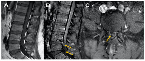 A 41-year-old male presented to the ED post-COVID-19 vaccination (Johnson & Johnson vaccine) with complaints of generalized weakness, difficulty ambulating two weeks post-vaccination. On physical examination MRC grade 4/5 in lower extremity throughout. Reflexes were absent. Upon admission, MRI of the brain, lumbar spine, and cervical spine without contrast were unremarkable. CSF revealed increased protein, normal cell count, and albumino cytological dissociation. EMG/NCS revealed findings consistent with demyelinating polyneuropathy. The patient was treated with and responded well to IVIG. At a two-month follow-up, the patient stated he was ambulating with assistance. Follow-up lumbosacral spinal MRI imaging with/without contrast revealed thickened cauda equina nerves. These findings raised concern for disease progression to chronic inflammatory demyelinating polyneuropathy (CIDP) (Figure 2).