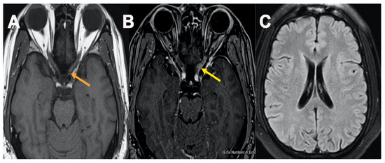 MRI orbit Figure 3, axial T1 plain (A) and post contrast fat saturation axial images (B) showed abnormal enhancement within the intracanalicular portion of left optic nerve (B) (yellow arrow), MRI brain axial FLAIR cut at level of lateral ventricle showed no abnormal T2/FLAIR signal changes (C).