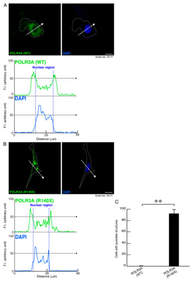 The R140X mutant proteins, but not the wild type proteins, of POLR3A are accumulated in punctate structures in FBD−102b cells. (A,B) Oligodendroglial FBD−102b cells, surrounded by white lines, were transfected with the plasmid encoding wild type (WT) POLR3A or the R140X mutant constructs. Transfected cells were detected with transfected proteins (green) and nuclear DAPI (blue). Scan plots were performed along the white dotted lines in the direction of the arrows in images. Graphs showing the fluorescence intensities (arbitrary units) along the white dotted lines in the direction of the arrows (black dotted lines in right bottom panels) can be seen in the bottom panels. (C) Percentages of cells with punctate structures were statistically assessed (** p < 0.01; n = 3 fields).
