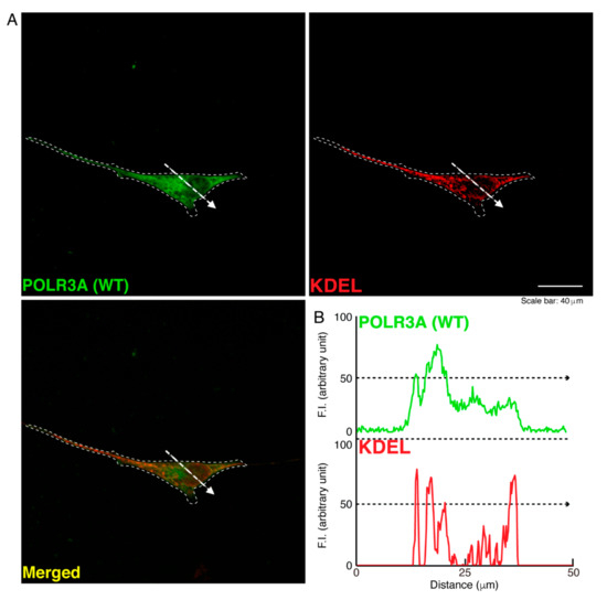 The wild type POLR3A proteins are not co-localized with the ER in cells. (A,B) FBD−102b cells were transfected with the plasmid encoding the wild type (WT) POLR3A and stained with transfected proteins (green) and an antibody against the KDEL antigen (red). Scan plots were performed along the white dotted lines in the direction of the arrows in the color images (green and red as well as merged images). Graphs showing the fluorescence intensities (arbitrary units) along the white dotted lines in the direction of the arrows can be seen in the right bottom panels (black dotted lines).