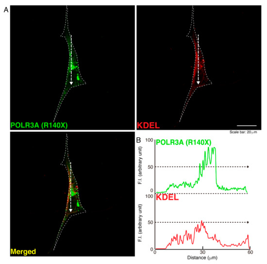 The POLR3A mutant proteins are not co-localized with the ER in cells. (A,B) FBD−102b cells were transfected with the plasmid encoding the POLR3A R140X construct (green) and stained using an antibody against the KDEL antigen (red). Scan plots were performed along the white dotted lines in the direction of the arrows in the color images (green and red as well as merged images). Graphs showing the fluorescence intensities (arbitrary units) along the white dotted lines in the direction of the arrows can be seen in the right bottom panels (black dotted lines).