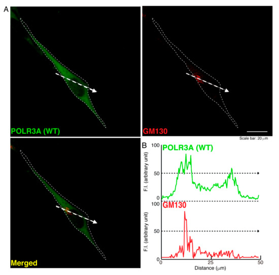 The wild type POLR3A proteins are not co-localized with the Golgi body in cells. (A,B) FBD−102b cells were transfected with the plasmid encoding the wild type (WT) POLR3A (green) and stained using an antibody against the GM130 antigen (red). Scan plots were performed along the white dotted lines in the direction of the arrows in the color images (green and red as well as merged images). Graphs showing the fluorescence intensities (arbitrary units) along the white dotted lines in the direction of the arrows can be seen in the right bottom panels (black dotted lines).