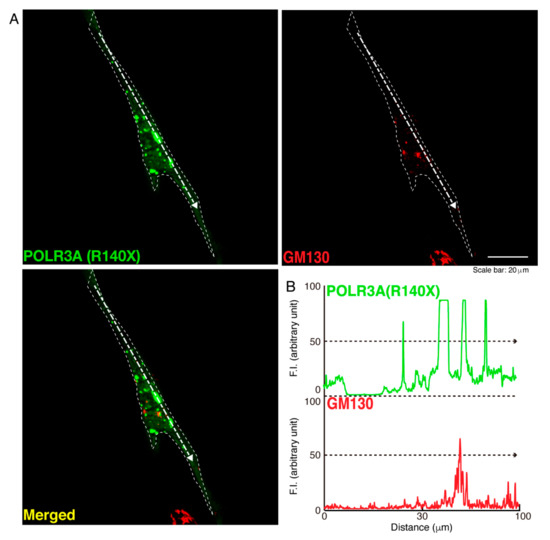The POLR3A mutant proteins are not co-localized with the Golgi body in cells. (A,B) FBD−102b cells were transfected with the plasmid encoding the POLR3A R140X construct (green) and stained using an antibody against the GM130 antigen (red). Scan plots were performed along the white dotted lines in the direction of the arrows in the color images (green and red as well as merged images). Graphs showing the fluorescence intensities (arbitrary units) along the white dotted lines in the direction of the arrows can be seen in the right bottom panels (black dotted lines).