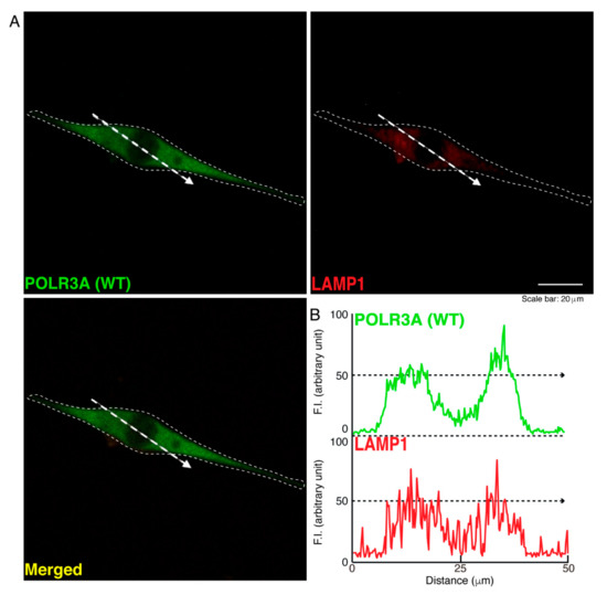 The wild type POLR3A proteins are not co-localized with the lysosome in cells. (A,B) FBD−102b cells were transfected with the plasmid encoding the wild type (WT) POLR3A (green) and stained using an antibody against the LAMP1 antigen (red). Scan plots were performed along the white dotted lines in the direction of the arrows in the color images (green and red as well as merged images). Graphs showing the fluorescence intensities (arbitrary units) along the white dotted lines in the direction of the arrows can be seen in the right bottom panels (black dotted lines).