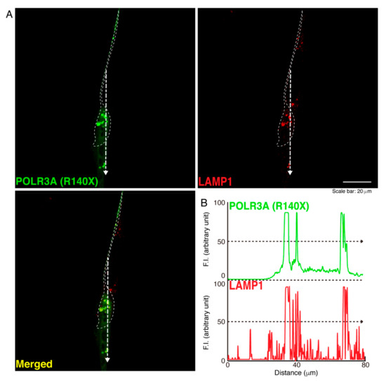 The POLR3A mutant proteins are co-localized with the lysosome in cells. (A,B) FBD−102b cells were transfected with the plasmid encoding the POLR3A R140X construct (green) and stained using an antibody against the LAMP1 antigen (red). Scan plots were performed along the white dotted lines in the direction of the arrows in the color images (green and red as well as merged images). Graphs showing the fluorescence intensities (arbitrary units) along the white dotted lines in the direction of the arrows can be seen in the right bottom panels (black dotted lines).