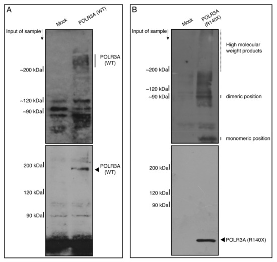 The POLR3A mutant proteins, but not the wild type proteins, exhibit dimeric and high-molecular-weight structures in non-denaturing polyacrylamide gel electrophoresis. (A,B) The lysates of FBD−102b cells transfected with an empty vector or with a plasmid encoding the wild type (WT) or POLR3A R140X construct were subjected to non-denaturing (upper images) and denaturing (lower images) polyacrylamide gel electrophoresis and detected using immunoblotting. The positions corresponding to the molecular weight of the wild type POLR3A monomer or the POLR3A R140X monomeric or polymeric (including high-molecular-weight products) structures are shown.