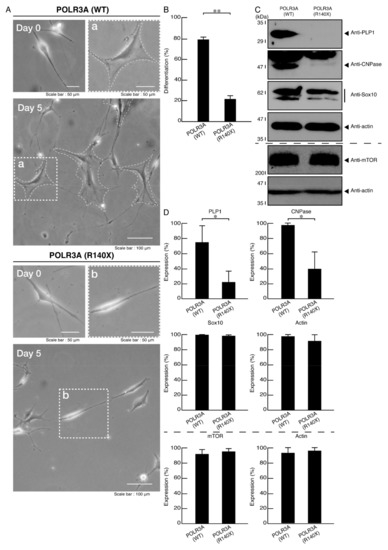 Cells harboring the POLR3A mutants, but not the wild types, fail to exhibit morphological differentiation. (A) FBD−102b cells harboring the wild type (WT) or R140X construct were allowed to differentiate for 5 days. Some cells in the bottom images are surrounded by white dotted lines (a and b). The square fields a and b indicated by dotted lines in the bottom panels are magnified in the upper panels a and b. Images of cells at day 0 are also shown. (B) Differentiated cells were statistically assessed (** p < 0.01; n = 3 fields). (C) The lysates of the respective cells were immunoblotted with an antibody against the differentiation (myelin) marker proteins PLP1 and CNPase, oligodendrocyte lineage cell marker Sox10, mTOR, and control actin. (D) Their expression levels are shown statistically compared to their respective controls (* p < 0.05; n = 3 blots).