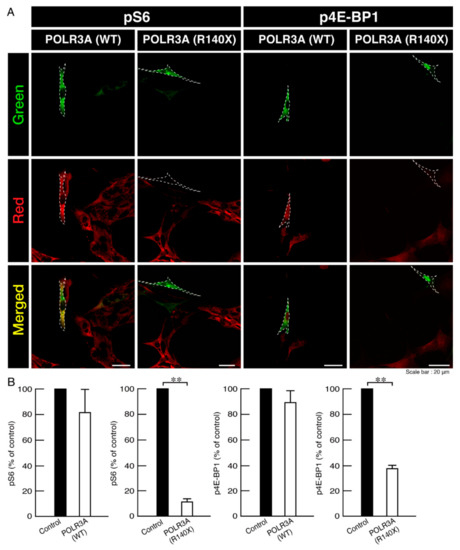 Cells harboring the POLR3A mutants, but not the wild types, decrease phosphorylation levels of ribosomal S6 and 4E-BP1 proteins. (A,B) FBD−102b cells harboring the wild type (WT) or R140X construct (green) were stained with an anti-(pS240 and pS244) ribosomal S6 protein (pS6) or anti-(pT37)4E-BP1 (p4E-BP1) antibody (red) whose phosphorylation acts downstream of mTOR signaling. Their phosphorylation levels are shown statistically compared to those in their respective control cells under each image (** p < 0.01; n = 3 fields).