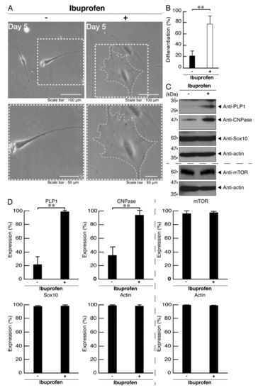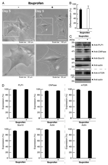 Cells from the oligodendroglial FBD−102b cell line (a mouse brain oligodendroglial precursor cell line) were kindly provided by Dr. Y. Tomo-oka (Tokyo University of Science, Chiba, Japan; and Riken, Saitama, Japan). FBD−102b cells [18,19,20,21,22] were cultured on standard cell culture dishes (Greiner, Oberösterreich, Germany) in a culture medium consisting of DMEM/Nutrient Mixture F-12 (Nacalai Tesque, Kyoto, Japan) containing 10% heat-inactivated FBS (Thermo Fisher Scientific, Waltham, MA, USA) and PenStrep (Thermo Fisher Scientific) in 5% CO2 at 37 °C. To induce differentiation, FBD−102b cells were cultured for 5 days in the same culture medium without FBS on cell culture dishes with advanced TC polymer surface modification (Greiner) in 5% CO2 at 37 °C [18,19,20,21,22]. We incubated cells with or without 300 μM ibuprofen [14,15,16,17] and/or 500 nM AH6809 (IC50 = 6.8 nM for prostaglandin EP1 receptor in a cell-free system; see the Tocris Biological Activity website, https://www.tocris.com/ accessed on 1 April 2020) for 2 days. In addition, we changed the culture medium into a newly-prepared medium containing ibuprofen and/or AH6809, and further incubated cells with each or both of them for 3 days. Cells with widespread membranes (more than 75 μm square fields; Image J software [Bethesda, MD, USA]) were identified as differentiated [18,19,20,21,22]. We confirmed that FBD−102b cells were viable under each experimental condition by verifying that the attached trypan-blue (Nacalai Tesque)-incorporating cells made up less than 5% of all the cells in each culture. Along with these observations, the expression levels of myelin marker proteins were confirmed by immunoblotting techniques. FBD−102b cells form widespread membranes and express myelin marker proteins [18,19,20,21,22]. However, it is unlikely that FBD−102b cells are able to achieve the terminal differentiated phenotype, since they fail to exhibit the myelin web-like membrane structures needed to wrap neuronal axons with their membranes.
