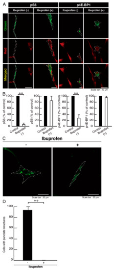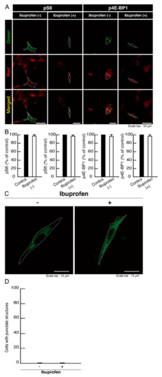 Ibuprofen is a NSAID that is known to be an activator of mTOR signaling [14,15,16,17]. It has also been reported to have broad neuroprotective effects [15,17]. Therefore, we attempted to determine whether ibuprofen can reverse undifferentiated phenotypes mediated by the R140X mutation of POLR3A. The treatment with ibuprofen resulted in differentiated phenotypes in cells harboring the R140X mutant constructs (Figure 11A,B). The results of changes in these cellular phenotypes were supported by increased expression of PLP1 and CNPase (Figure 11C,D). Expression levels of Sox10 and actin were comparable in the presence or absence of ibuprofen. In addition, expression levels of mTOR proteins are comparable in the presence or absence of ibuprofen. It is unlikely that ibuprofen affects the expression levels of mTOR proteins. In cells harboring the R140X mutant constructs, ibuprofen reversed the phosphorylation levels of ribosomal S6 and 4E-BP1 proteins (Figure 12A,B) and aggregation-like punctate structures (Figure 12C,D).
