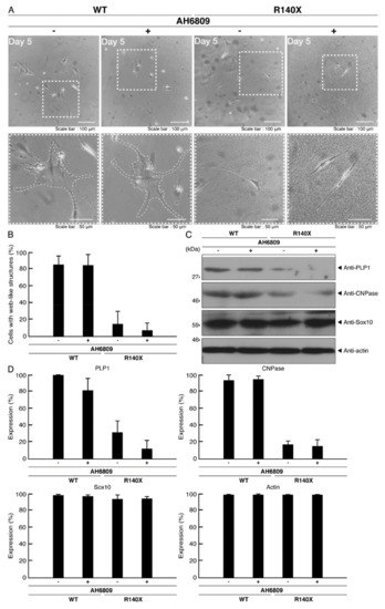 AH6809 does not have significant effects on morphological differentiation. (A) FBD−102b cells harboring the wild type (WT) or R140X POLR3A were allowed to differentiate in the presence or absence of AH6809 for 5 days. Some cells in upper images are surrounded by white dotted lines. The square fields indicated by dotted lines in the upper panels are magnified in the respective lower panels. (B) Differentiated cells were statistically assessed (n = 3 fields). (C) The lysates of the respective cells were immunoblotted with an antibody against differentiation (myelin) marker proteins PLP1 and CNPase, oligodendrocyte lineage cell marker Sox10, and control actin. (D) Their expression levels are shown statistically compared to their respective controls (n = 3 blots).