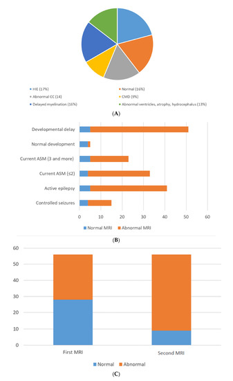 (A) MRI brain etiologies. (B) Normal and abnormal 2nd MRI compared to development, medications and epilepsy. (C) Normal and abnormal MRIs upon follow-up.