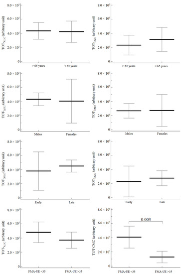 No differences were noted for CMC considering age, sex and distance from stroke onset. Significantly higher values were noted in relation to the baseline value of FMA-UE for the more impaired subgroup for TOT-CMC (p = 0.003), AFF-CMC (p = 0.013) and UN-CMC (p = 0.018) (Figure 2).