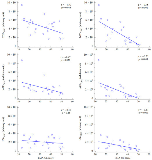 Cortical oxygenation was correlated with the FMA-UE score for both TOT-AUC and AFF-AUC but not for UN-AUC. Upper arm function was also significantly correlated with TOT-CMC, AFF-CMC and UN-CMC. Data are reported in Figure 3.