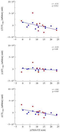 A significant inverse correlation was found for baseline TOT-CMC/days and AFF-CMC/days with variations in FMA-UE at the end of rehabilitation (r = −0.49; p = 0.026 and r = −0.50; p = 0.022, respectively).