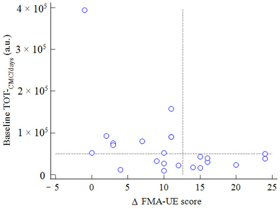 Interestingly, none of the patients with a baseline TOT-CMC/days > 5000 a.u. reached the minimal clinically important difference (MCID) for FMA-UE (values > 12.4 [28]) Figure 7.