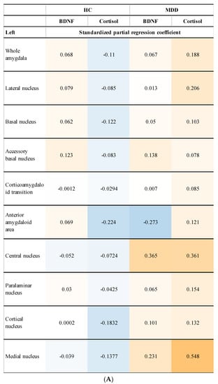 Relationship between left (A) and right (B) amygdala volume and plasma levels of BDNF and cortisol (Subgroup analysis). Plasma levels of cortisol were significantly positively correlated with the left medial nucleus (β = 0.548, p = 0.0082) (A) and right central nucleus (β = 0.347, p = 0.043) (B) in the MDD group, however, correction for multiple comparisons failed to show statistically significant differences. Positive correlations are shown in orange, negative correlations are shown in blue, and the strength of the correlation is expressed in terms of concentration (−1.0–1.0).