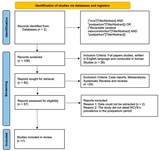 We used the PubMed and Google Scholar databases for this systematic review. The search was conducted between 1 March 2022 and 15 March 2022. We used an advanced search strategy with the following terms: (RCVS [Title/Abstract]) AND (Postpartum [Title/Abstract]).