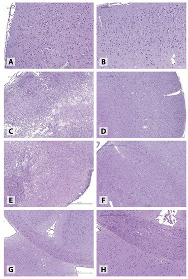 Histological features of different brain structures in experimental animals. (A,B) motor cortex ((A), right hemisphere; (B), left hemisphere) in an IS 45 rat; (C,D) somatosensory cortex ((C), right hemisphere; (D), left hemisphere) in an IS 45 rat; (E,F) striatum (E), right hemisphere, (F), left hemisphere in an IS 45 rat; (G,H) corpus callosum ((G) in an IS 45 rat; (H) in a control rat). Haematoxylin and eosin stain.