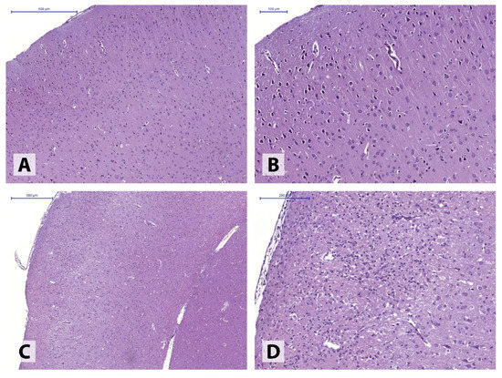 The ischemic hemisphere following 30-min MCAO presented with markedly polymorphic pathological alterations in different brain structures. In the majority of the animals (4), perivascular and pericellular edema of varying degrees was observed, accompanied by hypoxia-induced neuronal dystrophic changes, without the loss of normal tissue structure (Figure 2A,B). In some animals (2), the post-ischemic alterations involved the formation of extensive tissue necroses in the injured hemisphere, found in both motor and somatosensory cortex (Figure 2C,D).