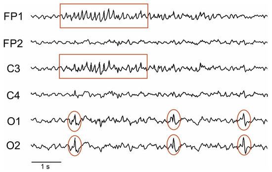 Epileptic activity (within red frames) observed in an IS 45 rat at post-surgery day 7. Red ellipses mark the spikes in the O1/O2 area (above the hippocampus).